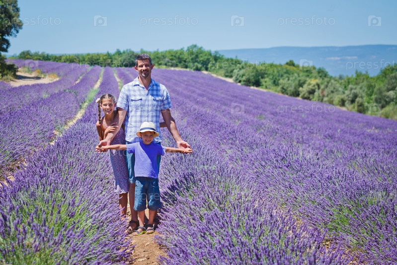 Отец с детьми в лавандовом поле