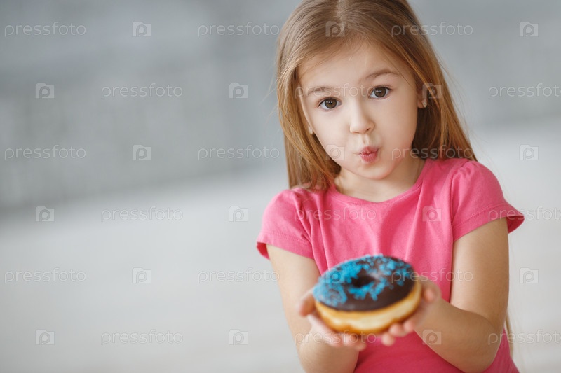 Красивая маленькая девочка держит пончик