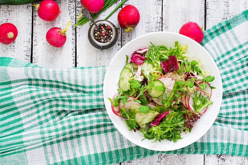 Салат из свежих огурцов, редиса и травы. Вид сверху