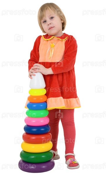 Маленькая девочка с пластиковой игрушечной пирамидой на белом