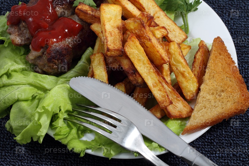 Мясо с кетчупом, картофель фри, поджаристый хлеб, зеленый салат, нож и вилка на тарелке