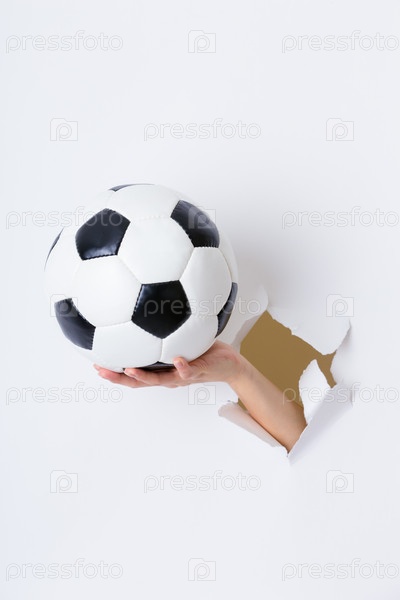 Рука, протянутая сквозь отверстия в бумаге с футбольным мячом