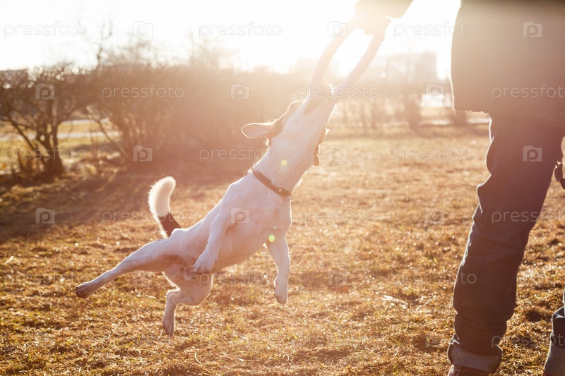 Женщина играет с собакой
