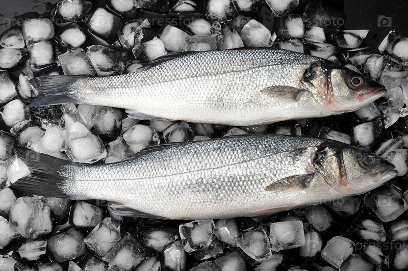 Сырая рыба сибас на льду