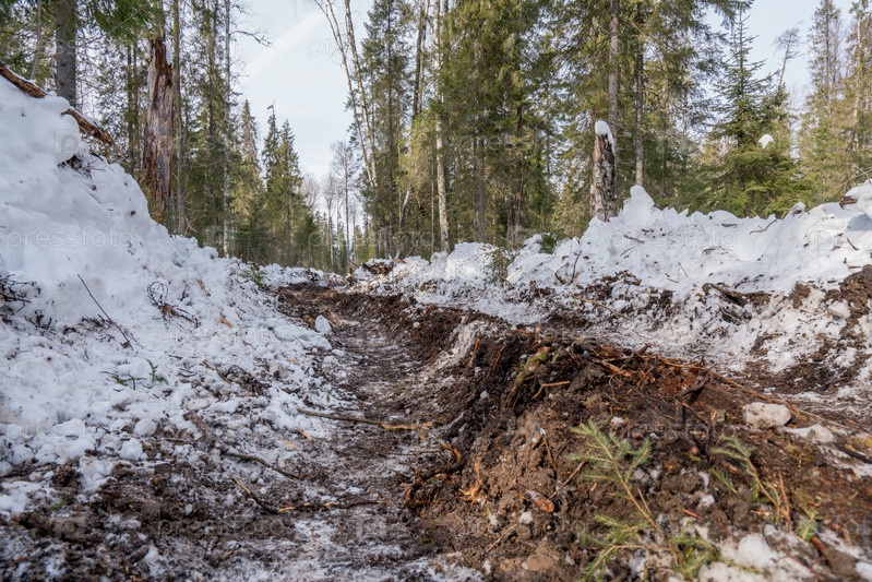 Трек от грузовиков в зимнем лесу