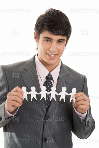 Портрет улыбающегося бизнесмена, держащего людей, вырезанных из бумаги