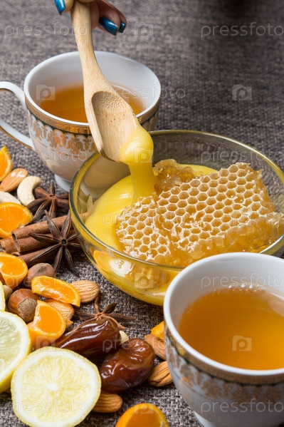 Мед, чай и фрукты с орехами