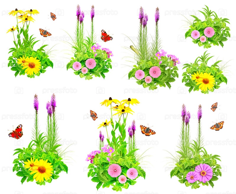 Цветы и бабочки на белом фоне