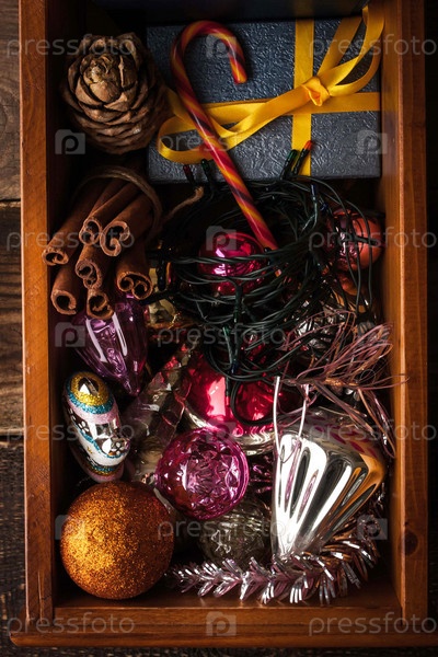 Деревянная коробка с рождественскими украшениями