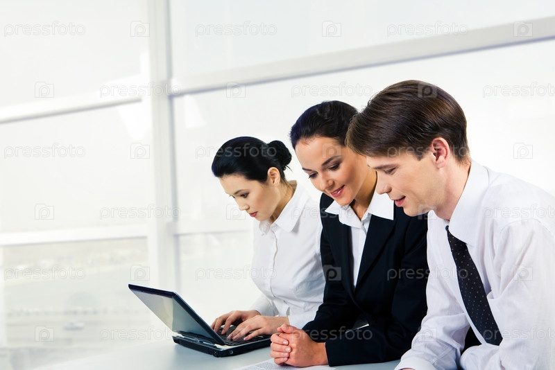 Портрет двух деловых партнеров, общающихся во время просмотра документа с бизнес-женщиной на заднем плане