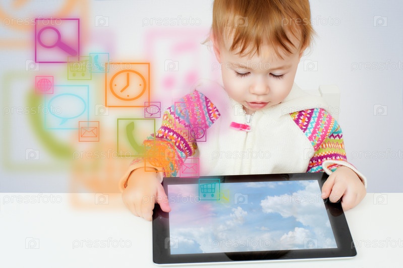 Маленький ребенок играет с планшетным компьютером