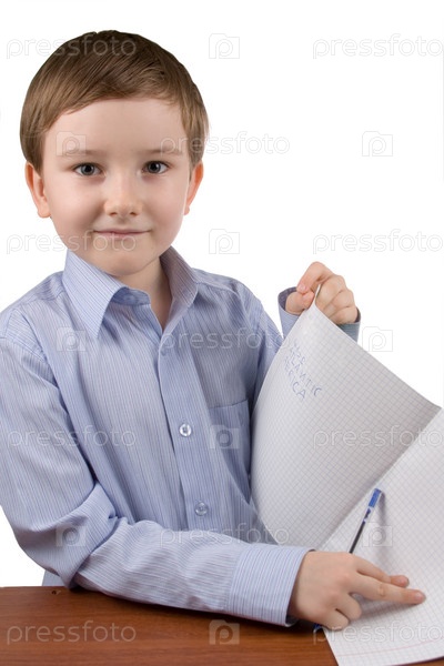 Мальчик показывает тетрадь на белом фоне