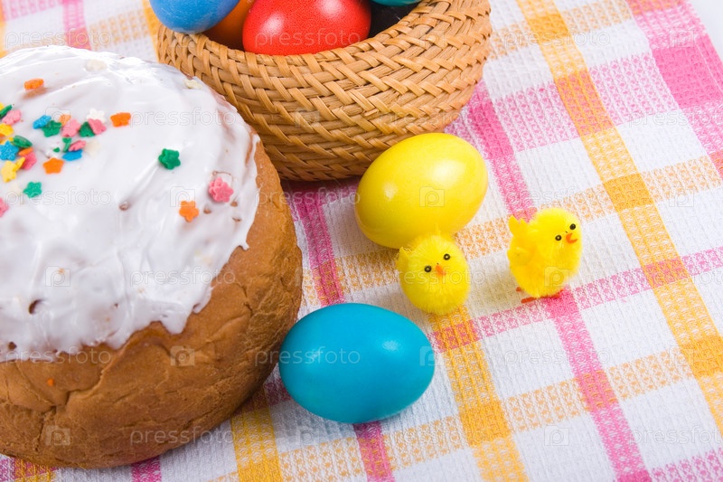 Пасхальные яйца, кулич и цыплята