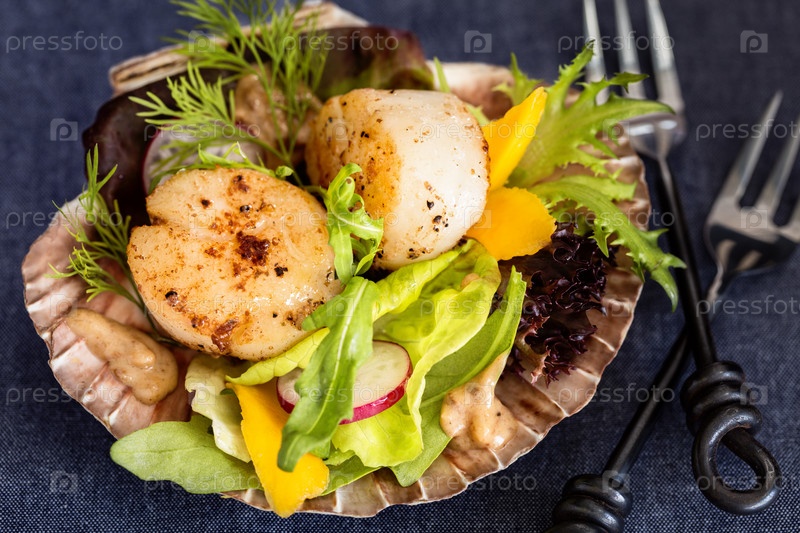 Обжаренные гребешки и салат с манго