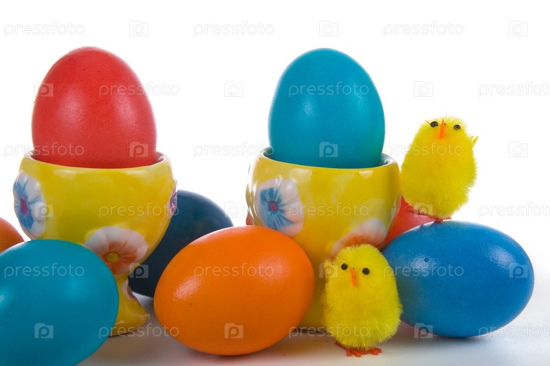 Пасхальные яйца и цыплята на белом фоне