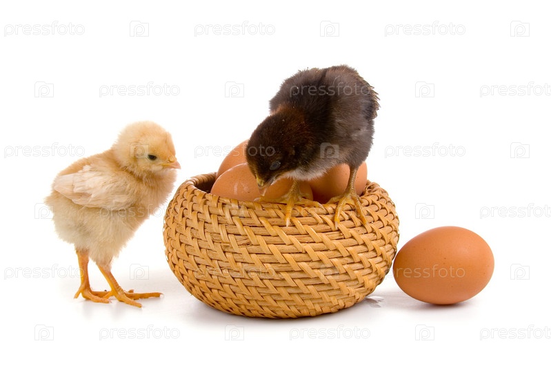 Цыплята и корзина яиц на белом фоне