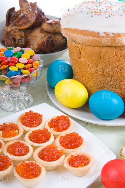 Пасхальный кулич, яйца и закуски на праздничном столе