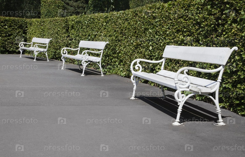 Белые скамейки в парке