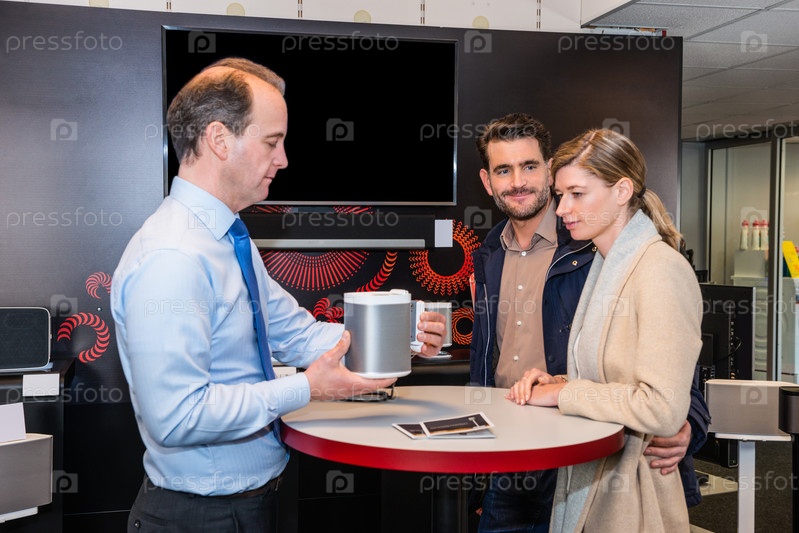 Помощник, показывая компактный динамик пара