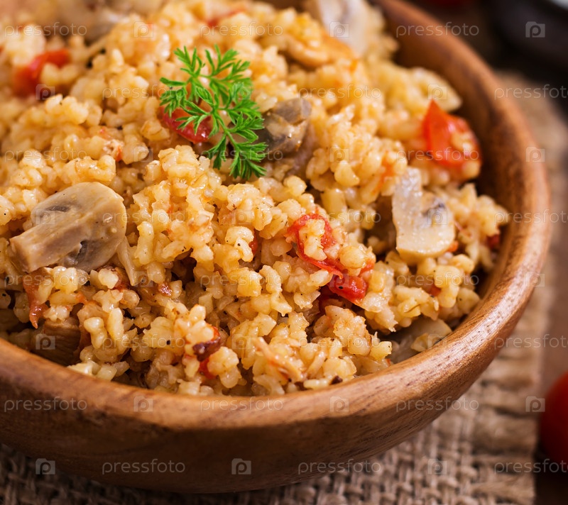 Булгур с курицей, шампиньонами и томатами