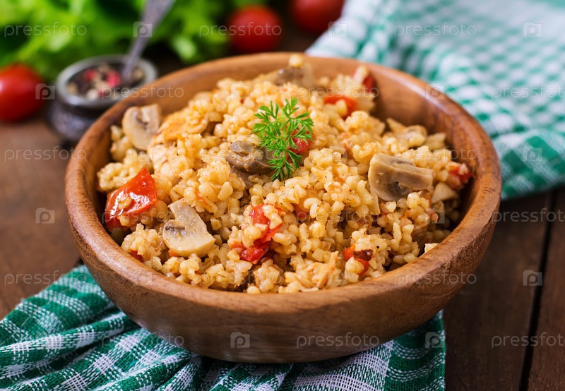 Булгур с курицей, шампиньонами и томатами
