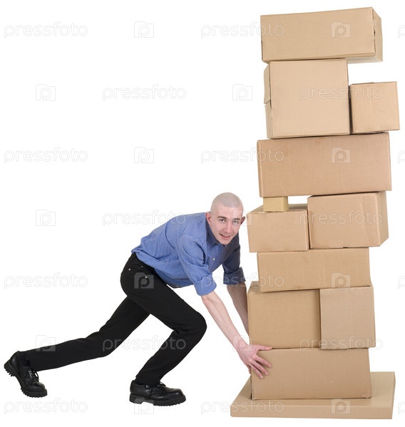 Мужчина толкает кучу из картонных коробок на белом