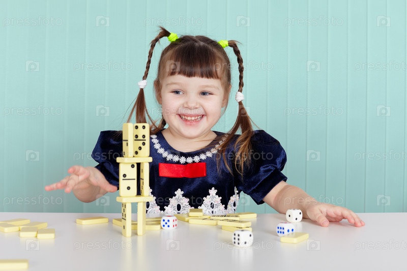 Маленькая девочка строит башню лотереи, сидя за столом