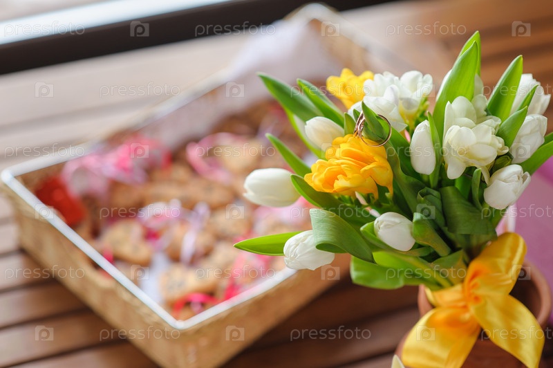 Обручальные кольца на букете тюльпанов