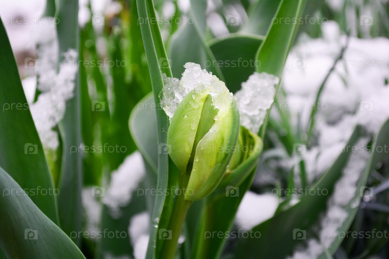 Бутон тюльпана в снегу