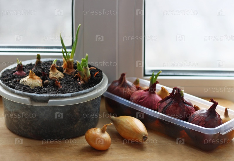 Пророщенный лук на подоконнике