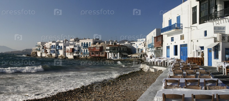 Набережная на острове Миконос, в Греции. Панорама