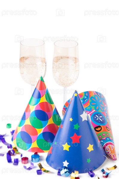 Праздничные колпаки, шампанское и конфетти на белом фоне