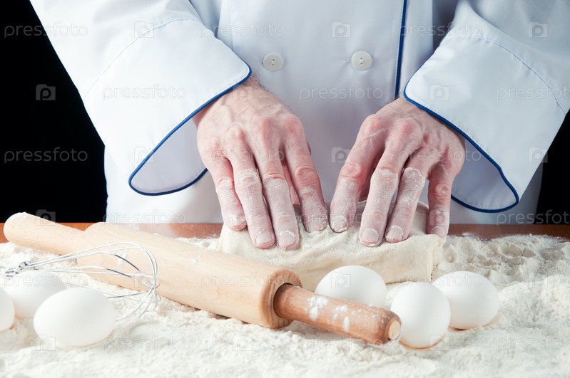Руки пекаря замешивают тесто