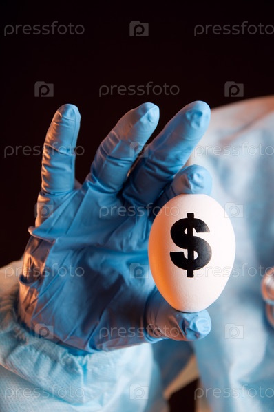 Белое яйцо со знаком доллара в руке ученого