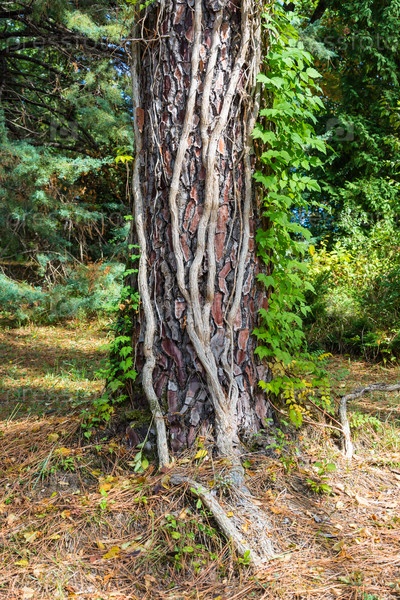 Виноград обвивает толстый ствол дерева