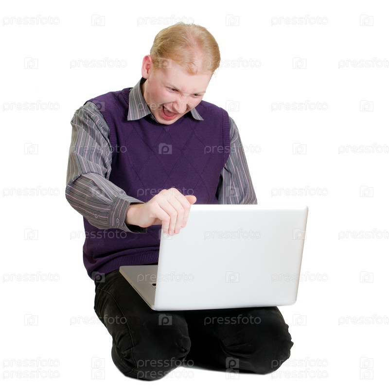 Счастливый офисный работник с ноутбуком сидит на белом фоне