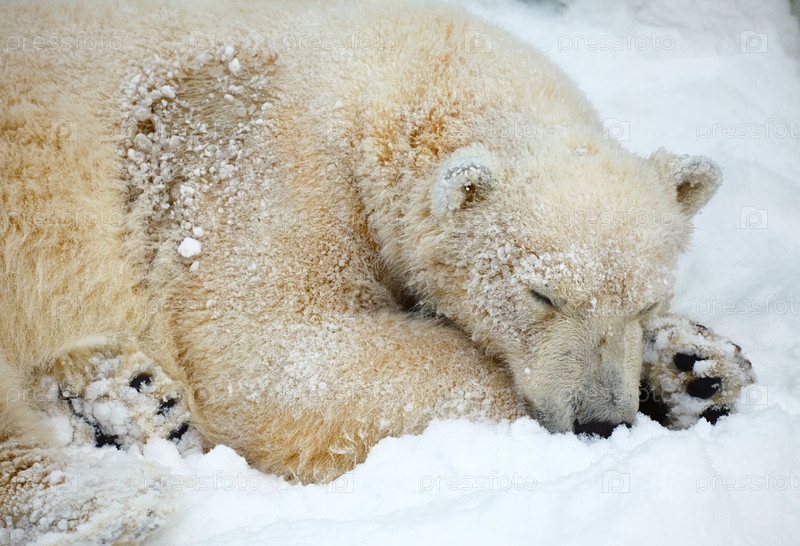 Спящий белый медведь на снегу