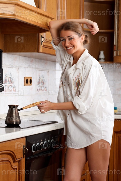 Молодая женщина на кухне готовит кофе