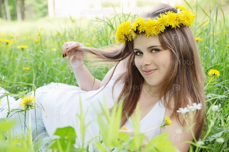 Женщина с венком на голове лежит на траве