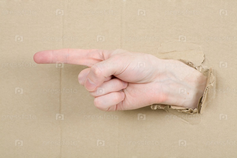 Жест мужской руки через отверстие в картон