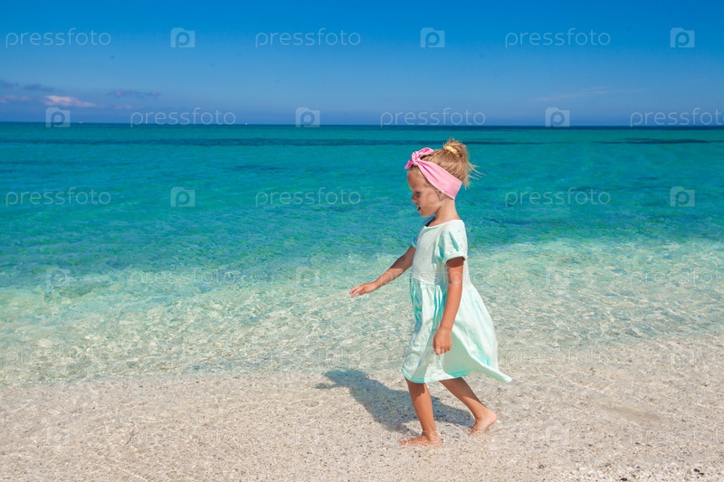 Маленькая девочка на тропическом пляже с водой бирюзового океана