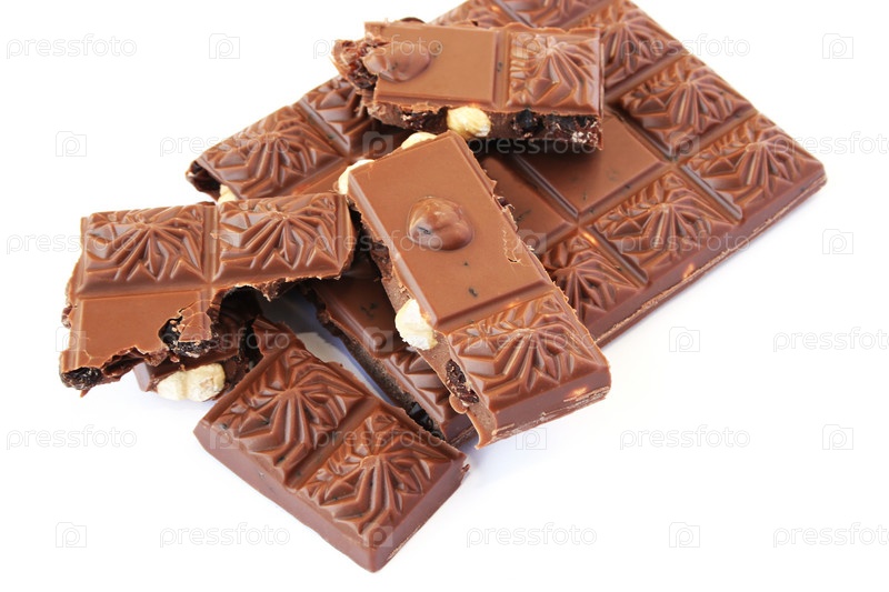 Шоколад с орехами и изюмом, белый фон