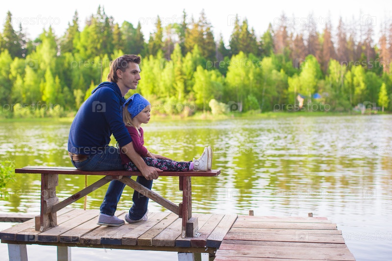 Молодой отец и дочь у озера