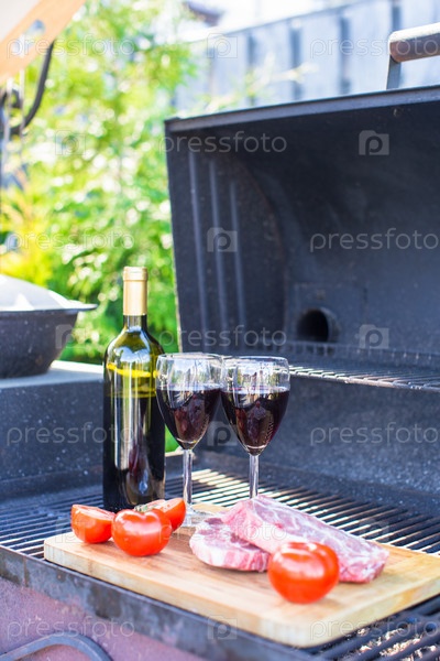 Свежее мясо, овощи и бутылка вина