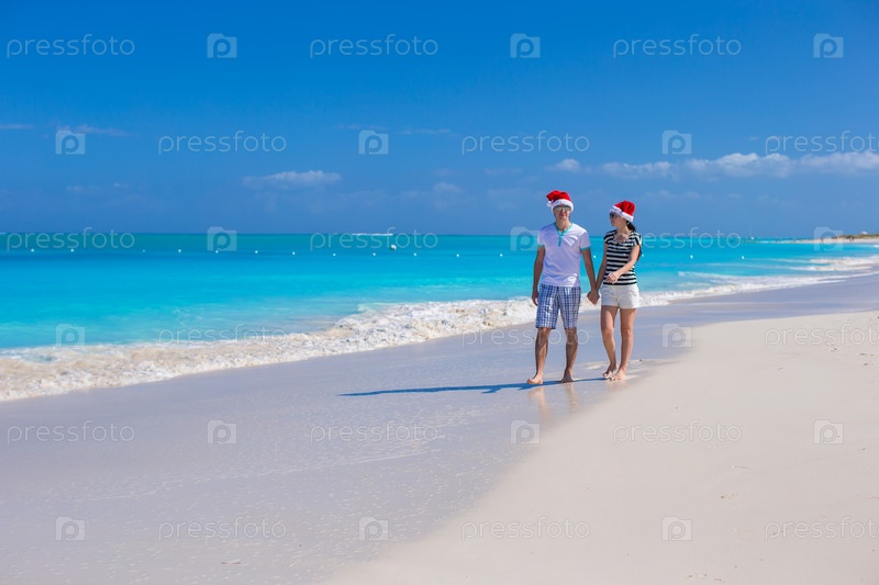Молодая пара гуляет по пляжу на Рождество