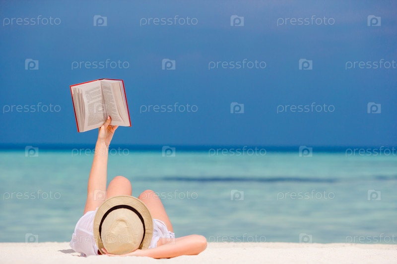 Молодая девушка читает книги на пляже