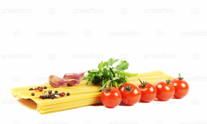 Сырые спагетти, специи, помидоры и чеснок