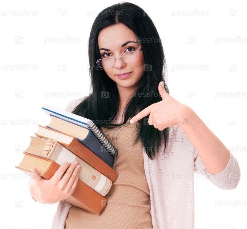 Молодая женщина привлекает внимание к книгам, изолирована на белом фоне
