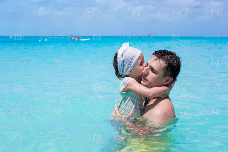 Счастливый отец с маленькой дочкой в море