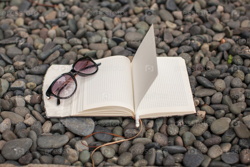 Блокнот и очки на гальке